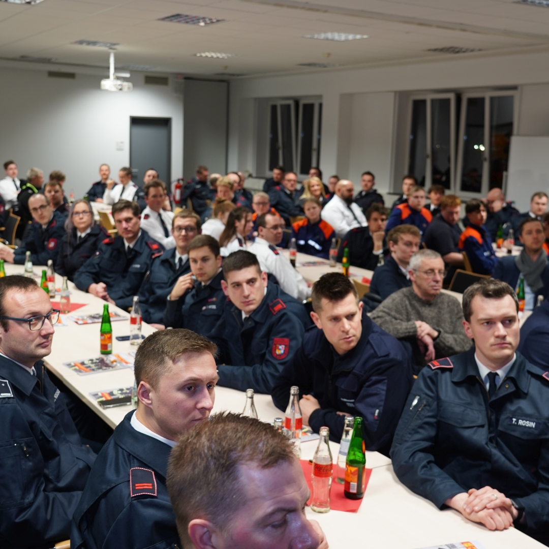 Ein weiterer Höhepunkt war die Stickerstars-Aktion, die auf Initiative des Broicher Löschzugführers entstand. Sven Werner berichtete, dass er zunächst skeptisch gewesen wäre und nicht an den Erfolg der Aktion geglaubt habe, doch sei er schnell eines Besseren belehrt worden. Die Aktion entwickelte sich nach seiner Aussage für die Feuerwehr zur größten Team-Building-Aktion des Jahres. Überall auf den Feuerwachen wurden fleißig Sticker gesammelt und getauscht und dadurch auch der Zusammenhalt zwischen Haupt- und Ehrenamt weiter gestärkt. Weiterhin berichtete er von den Feierlichkeiten zum 100-jährigen Jubiläum der Berufsfeuerwehr und erinnerte daran, dass 2026 bereits das nächste Jubiläum ansteht: Die Freiwillige Feuerwehr feiert dann ihr 25-jähriges Bestehen.